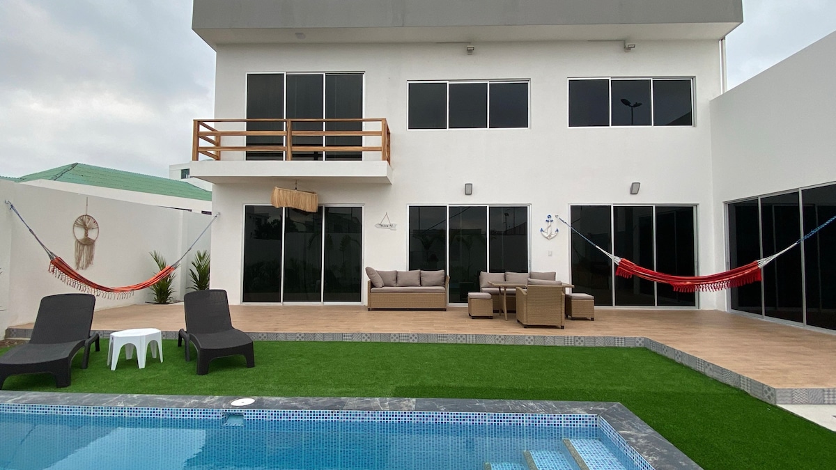 Great resort like home! Pool with a Slide and volley ball net, Jacuzzi, ocean front, with plenty of spaces for relaxing and enjoying the beach weather. This complete home has very spacious living areas and play room. Internet works great and in a pieceful area. The pictures speak for the home. The beach is calm and water is safe for swimmers. We have chairs and tent for the sun. The guard will be able to help you with all details of your stay.
