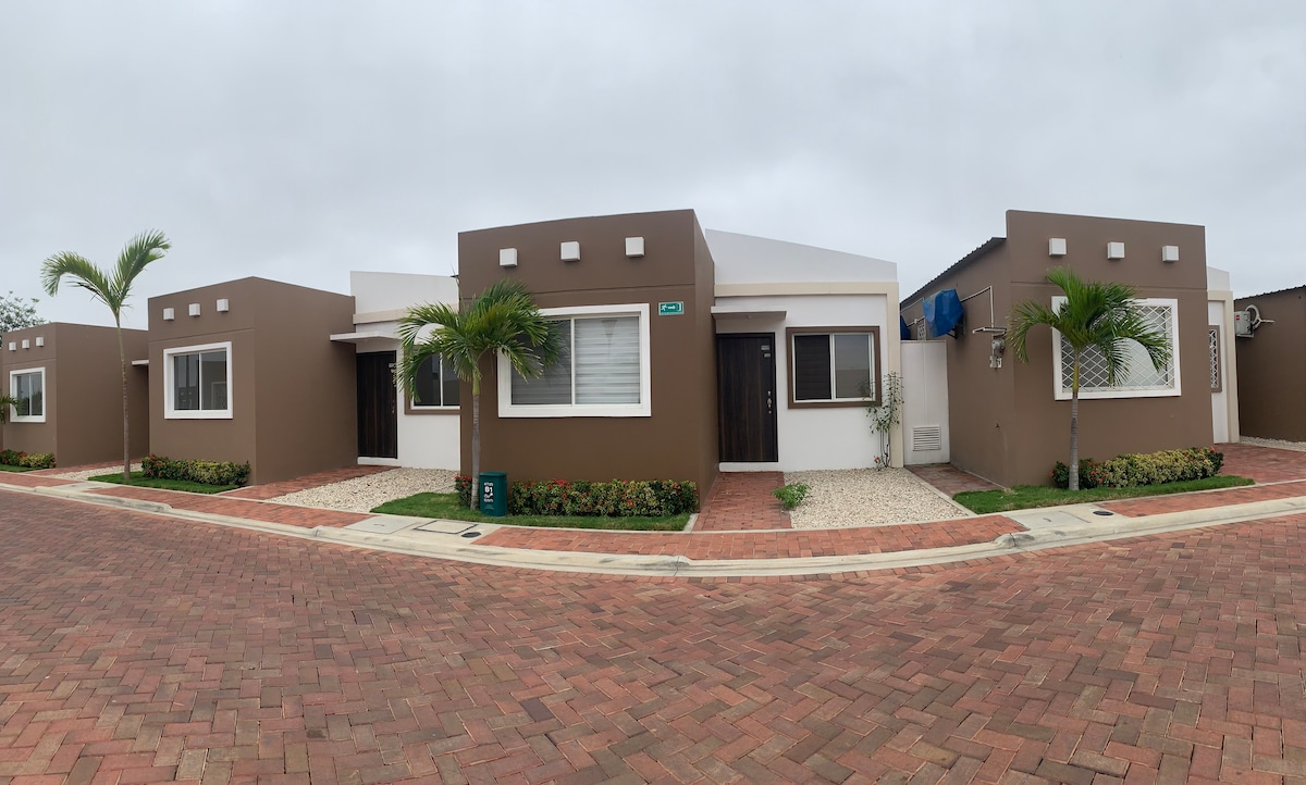 Excelente ubicación Mall a 3 minutos. Playa a 800m Urbanización muy segura- privada guardianía 24/7 Internet veloz 3 SmarTv+ NETFLIX Hermosa casa planta baja 100% climatizada-cómoda accesible, Fully equipada. 3 Dormitorios 7 camas todos full AC Excepcional Club, fantástica amplia piscina, sauna, gimnasio, parque infantil. Cocina bien equipada con MÁQUINA de HIELO! HORNO 4 tumbonas+parasol+ hielera