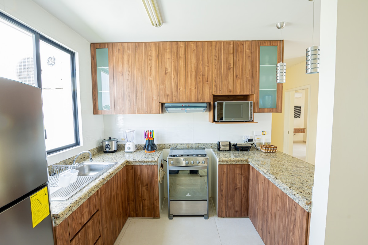 Diviértete con toda la familia en este alojamiento con estilo a 145 km de Guayaquil. Contamos con 2 dorm, 2 baños, En el 1 primer dorm Camas 2 1/2, en el 2do. Cama tipo 1 litera de 1.5 plaza y 1 cama individual 1.5 plaza, parqueo. 3 TV, 3 A/C, ascensor, agua caliente, lavadora y secadora, WIFI. Incluye acceso al Lobby, Gimnasio, área social con parrilla (bajo reserva), acceso a piscinas y jacuzzi. Además puedes visitar las lindas playas privadas que no tiene restricción de horarios.