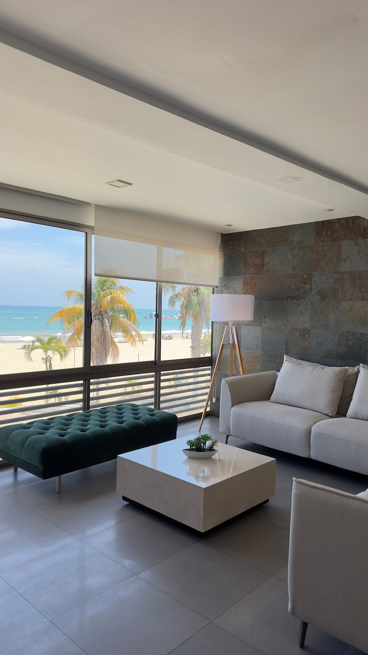 ACOGEDOR DEPARTAMENTO FRENTE AL MAR! Departamento ubicado en el 5to piso del condominio “Torre Naútica”, situado en el malecón de Puerto Lucía, cuenta con 3 dormitorios con A/C Split, 2 baños completos, agua caliente, cocina totalmente equipada y abierta, sala con área de cafetería y un amplio balcón frente al mar donde podrás disfrutar de los mejores atardeceres ! Único edificio con salida directa a la playa! Las fotos saldrán espectaculares!!