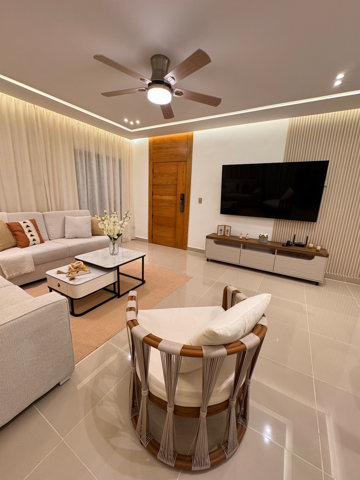 Enjoy a cozy stay in this 3-bedroom, 3-bathroom home in Downtown Punta Cana. Equipped with air conditioning, high-speed Wi-Fi, 2 Smart TVs, and a private terrace with a Picuzzi (no hot), it offers the perfect balance of comfort and convenience. The fully equipped kitchen, secure parking, 24/7 security, and large communal pool ensure a seamless experience. Just 3 minutes from Downtown Punta Cana and COCO BONGO, 12 minutes from the airport, and 15 minutes from the beach—book now!