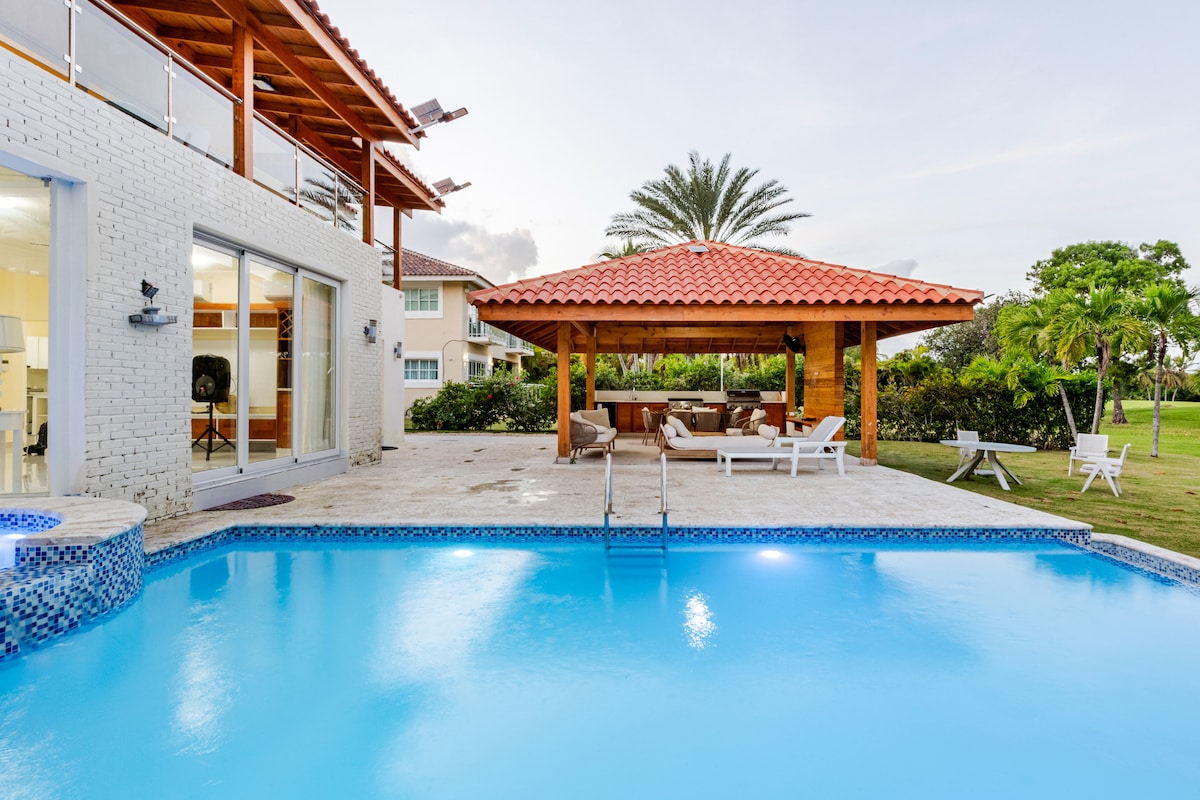 Sumergida en un hermoso campo de golf en el area residencial de Palma Real Villas en Cocotal exclusiva y privada totalmente segura Villa Andalucía, cuenta con su piscina privada con yacuzi un gazebo adentro de la piscina y diferentes espacios exterior para disfrutar de la Paz A pocos minutos de las hermosas playas donde podrás disfrutar de únicos tardecer y días entretenidos lleno de emoción y diversión