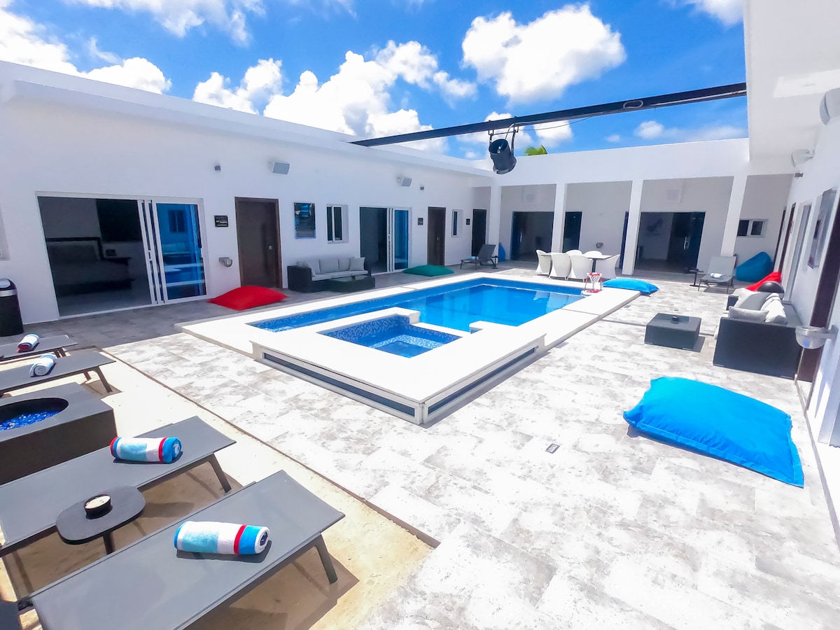 Luxurious Villa built in 2021 specifically for intimate groups. The villa features 6 bedrooms with AC's, private bathrooms and direct access to the pool. Villa has 2 kitchens (inside and outside), BBQ, full size bar, disco with DJ booth, artificial beach, foam machine for the HEATED pool, two Jacuzzi's (one private), game room, a movie theater and wifi throughout the entire property. The villa also comes with a full time caretaker/housekeeper to assist you at any time