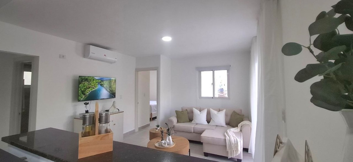 Apartamento de 2 habitaciones, 2 baños, y 1 parqueo asignando ideal para turistas que viajan en familia o personas que se desplazan por motivos de trabajo. ⚠️ Servicio de luz incluida. Otros cobran las luz extra. Residencial cerrado con seguridad perimetral, áreas verdes y áreas para juegos de niños. Ubicado a 7 minutos del aeropuerto internacional de Punta Cana, a 12 minutos de la playa y 5 minutos del centro comercial en vehículo. Ubicado en Residencial Ciudad Caracolí.🌴🌊