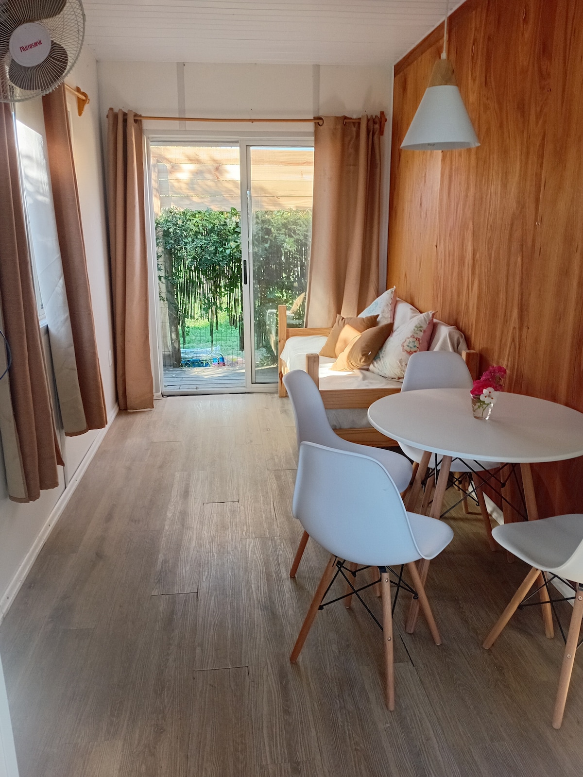Vení a descansar en este lugar único de naturaleza y playa. Casa de 25 metros cuadrados muy confortable, en un entorno natural de bosque nativo y a 3 minutos en auto y 15 caminando de la playa más linda de la zona. Cuenta con un pequeño terreno de 120 metros cuadrados con jardín, deck y parrillero. - 1 dormitorio con sommier matrimonial - 1 cama en el living con posibilidad de agregar un colchón más . - Ideal para 2 personas pero recibe hasta 4. -Aire acondicionado