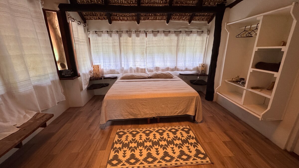 Cabañita ubicada en un segundo nivel con wc privado y regadera compartida FUERA DE LA HABITACION, con vistas al jardín, cama matrimonial con mosquitero, wi-fi Starlink gratis, ventilador, caja de seguridad y un esmerado servicio de limpieza diario.. Tenemos estacionamiento gratis a disponibilidad. El hotel se encuentra en primera línea de playa y cuenta con un restaurante-bar-cafeteria (Verifica sus horarios, gracias)