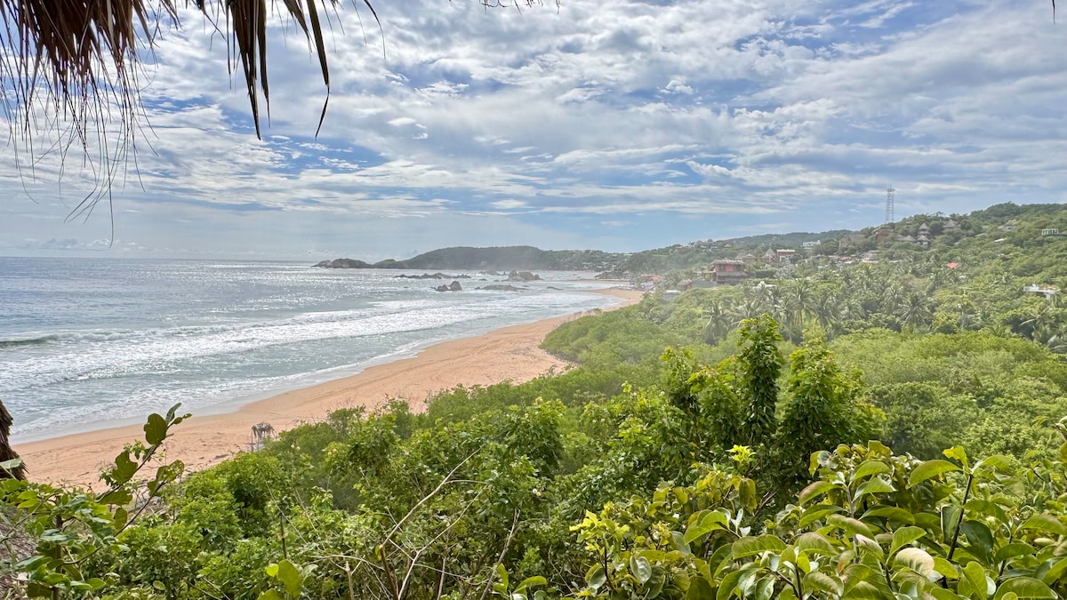 Casa El Delfin is a 3-level house only steps away from one of the most beautiful & peaceful beaches on the Pacific coast in Oaxaca, Mexico. It's located on the bay of Estacahuite just 5 minutes away from Puerto Angel (a small fishing village) & 40 minutes from Huatulco Airport. This listing is for the bungalow on the rooftop (3rd floor). It includes the entire rooftop (300 meters), open-air bedroom, dining space, and bathroom. The ocean view from the house is unforgettable.