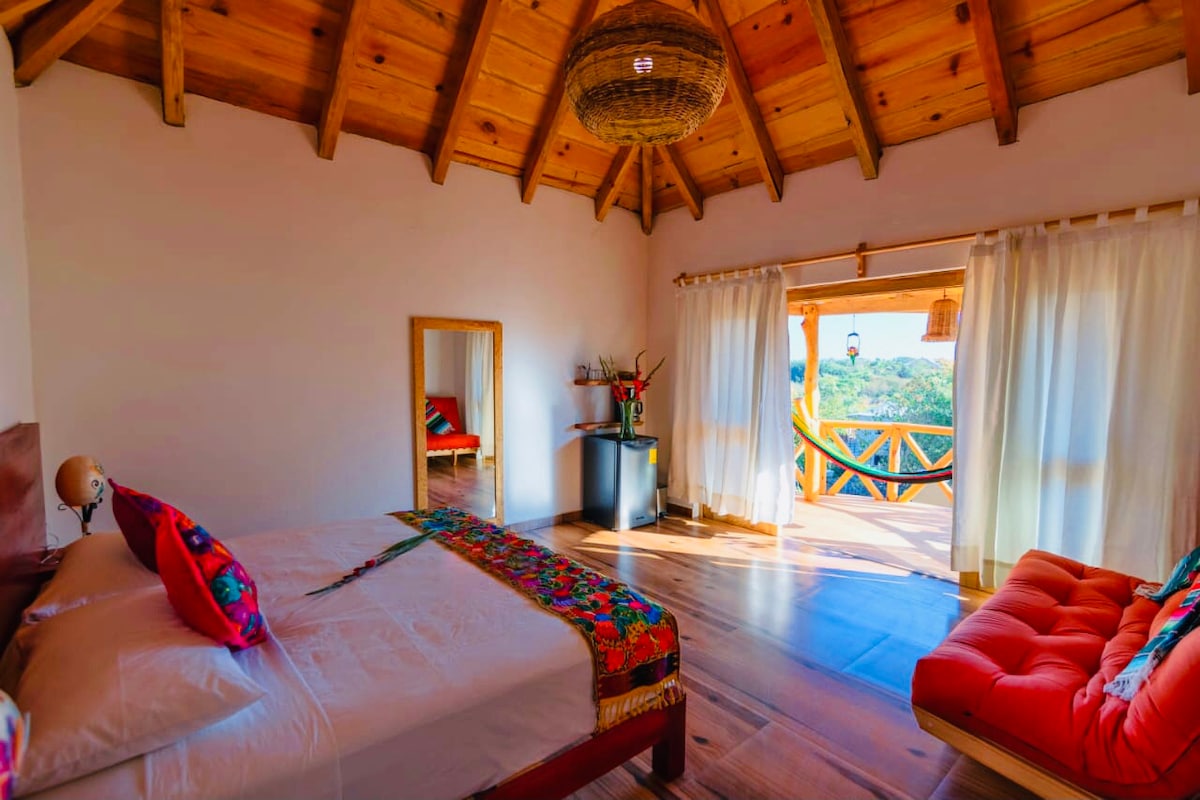 Casa Coco, está localizada en una zona muy tranquila, ideal para contemplar el amanecer y ver el sol salir por la montaña. De la calle principal a casa coco deberas de subir 61 escalones si vienes caminando, tambien contamos con acceso vehicular y estacionamiento sobre la calle. La casa esta equipada con una recamara con cama king y AC, baño privado con agua caliente, cocina, comedor, una fresca sala con vista a la copa de los árboles, y terraza con hamaca. Internet Starlink de alta velocidad