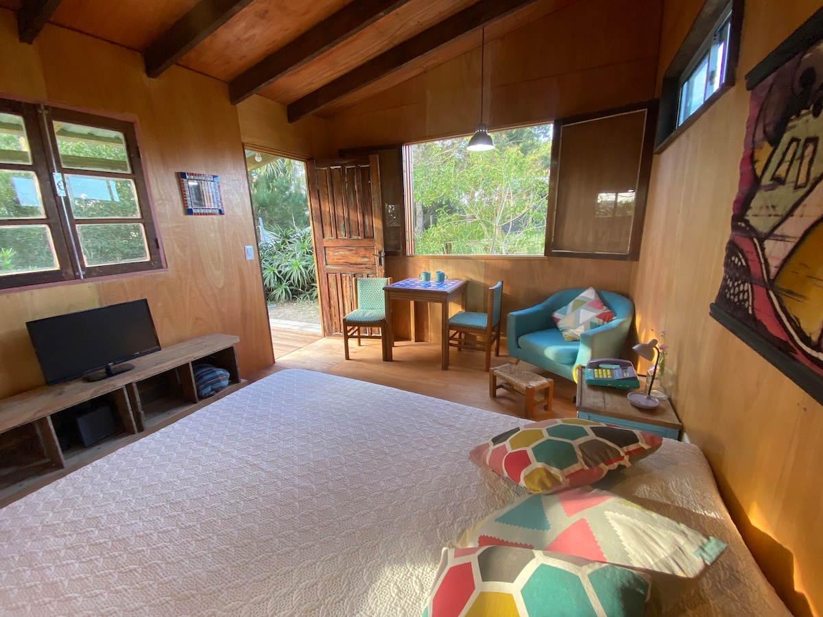 A 4 cuadras de la playa del Rivero, este pequeño apart hotel tiene el confort de una cabaña en el tamaño de una habitación de posada. Cada cabaña tiene baño completo con techo de vidrio y cañas, cama sommier doble y una cama individual, aire acondicionado, direcTV, WiFi, alarma, kitchenette completa, comedor, un pequeño living y una terraza al frente con vista al mar y un living con hamaca paraguaya. Contamos con una huerta orgánica disponible para que puedas consumir verduras de estación.