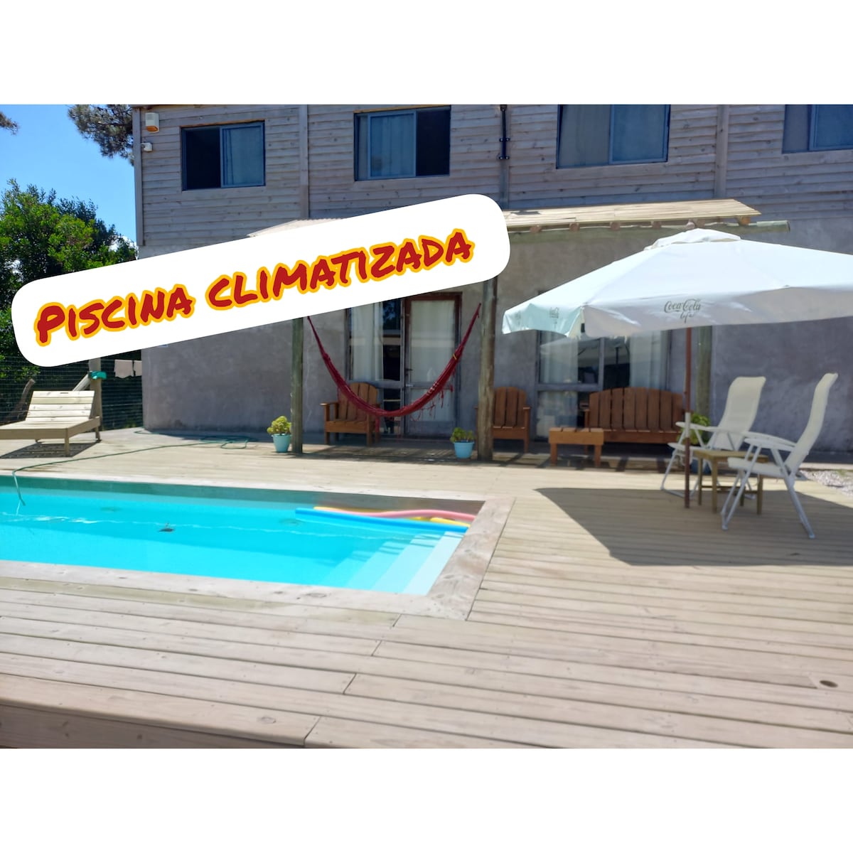 Relájate con toda la familia en este alojamiento donde la tranquilidad se respira. Disfruta de esta acogedora cabaña equipada para que tu estadía sea cómoda y agradable. Dos habitaciones: Una con cama doble y otra con cama marinera más un colchón individual. Capacidad ideal para 4 personas, con posibilidad de alojar hasta 5. Un baño con calefón a gas para agua caliente en todo momento. La piscina no es climatizada! Amplio patio, exclusivo uso de la piscina.