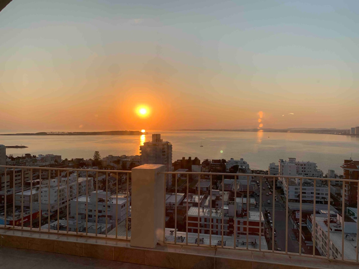 Prime beachfront location on Playa Mansa, Parada 7, directly across from Parador Imarangatu. Panoramic views of the bay and Isla Gorriti, with stunning sunsets from the balcony. Fully renovated in 2023, everything brand new. Features 2 bedrooms, 2 bathrooms, a bright living area, and kitchen with laundry. Includes daily housekeeping, beach service in summer, 24h reception, parking, private high-speed fiber WiFi, and linens.