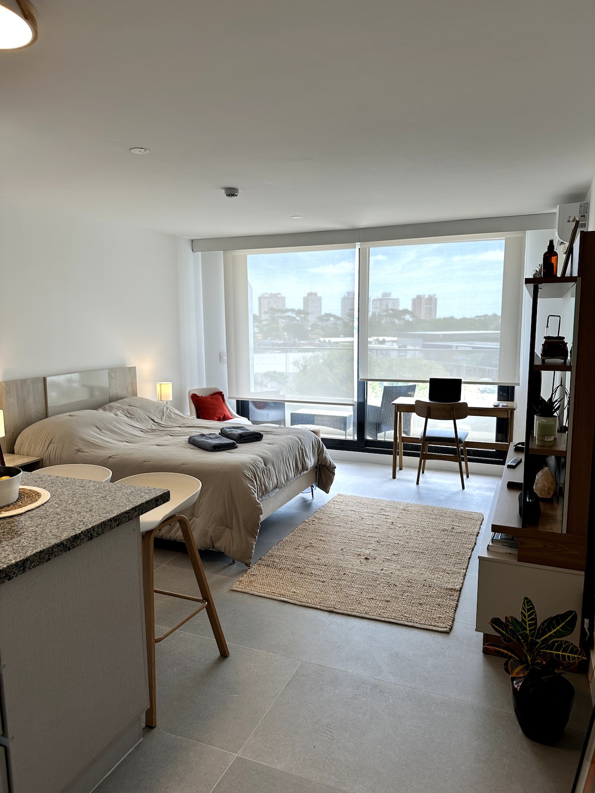 Este lugar tiene una ubicación estratégica: cerca de todo caminando. Tiendas , restaurantes, súper , etc. La mejor vista a los atardeceres del Puerto. Séptimo piso. Balcón amplio con mesa y 4 sillas y living exterior. A pesar de ser monoambiente es amplio y tiene todo!! Ropero grande . Mesada en cocina con banquetas. Cocina completa . Horno , añafe , microondas y heladera con freezer. Baño completo con roperos y lava seca ropa. Portero 24 horas. Cualquier necesidad extra , consultar.