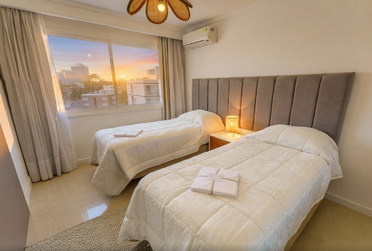 Precioso apartamento con vistas al mar a 120 metros de la playa, 1 dormitorio, living, baño, cocina y balcon, totalmente equipado y super comodo. El edificio cuenta con piscina climatizada interior con un jacuzzi , gimnasio, recepcion, dos piscinas exteriores y parrillero , un parrillero en la terraza con vista a la playa Mansa y la Brava y tambien parking. En una zona llena de restaurantes, mercados y mas. 😊