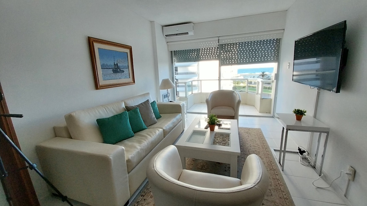 PRIMERA FILA FRENTE AL MAR en Playa Mansa y Parada 7, frente al parador Imarangatu. VISTA PANORÁMICA a la bahía y a la Isla Gorriti. Incluye servicio de mucamas TODOS LOS DIAS del año y servicio de playa en verano. TOTALMENTE RECICLADO EN 2023. TODO NUEVO. Todos los atardeceres en el balcón. 2 dormitorios, 2 baños, cocina con lavadero. Recepción 24 horas. Televisores SMART nuevos 2023. Wifi de fibra óptica (alta velocidad) de uso exclusivo del depto. Cochera Incluye sábanas y toallas.