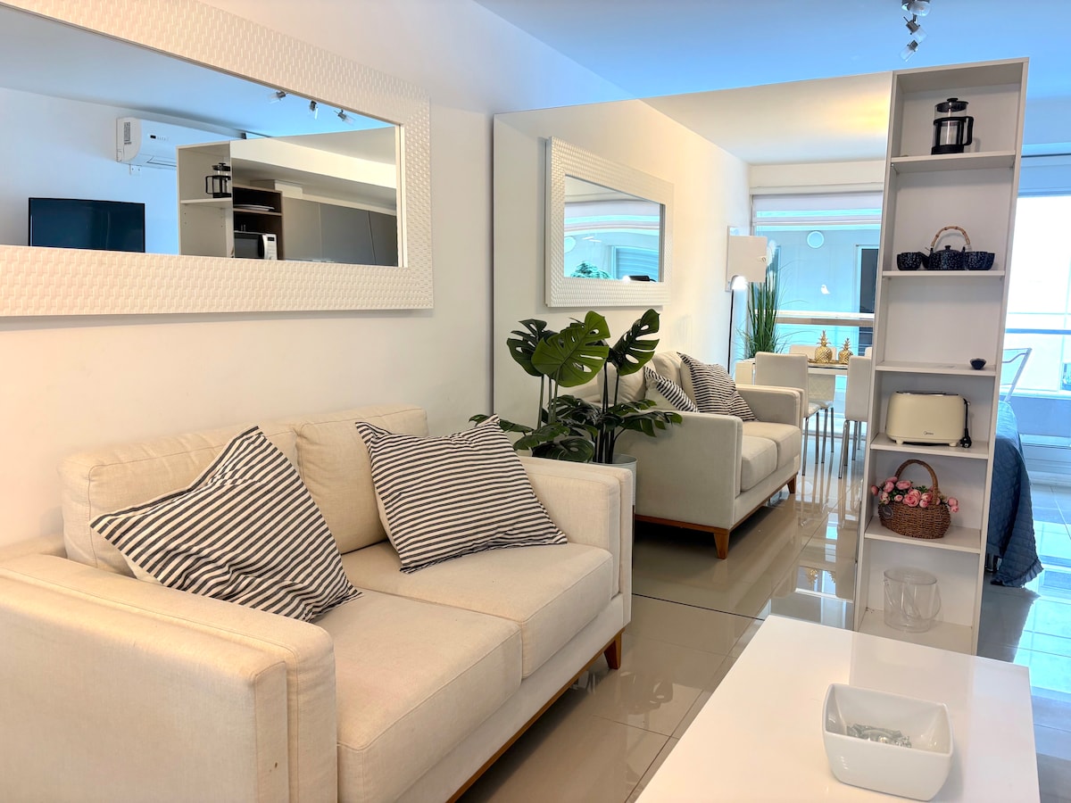 Moderno apartamento para 2 personas totalmente equipado con espectacular vista al mar y la península con 2 balcones, situado a cuadras del centro y de las playas mansa & brava. Incluye el uso de cochera propia, amenities de alta categoría como piscina interna y externa, sauna, gimnasio, business lounge y recepción atendida 24h. Ideal para relajarse y disfrutar de Punta del Este durante todo el año o combinar descanso y trabajo ya que dispone de una conexión rápida de internet (200 Mbps).