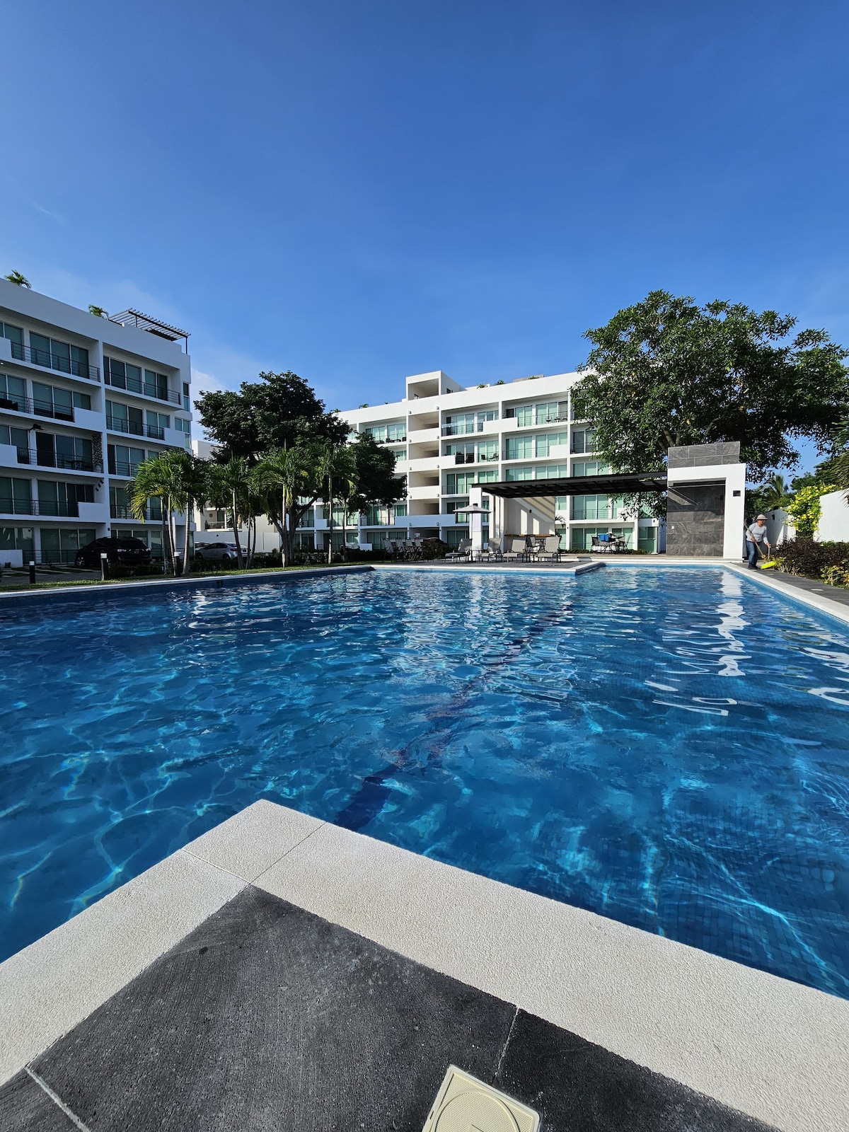 Ground floor apartment with all services and intact interiors after OTIS/JOHN. Huge pool with an amazing garden, private Jacuzzi, 24/7 security, 300 MB WIFI speed, and an equipped kitchen. Your private parking space is a few steps from the door. Located on the main Ave in the Diamante area, 7 min from the Aero and 1.2 km from the beach. 2 BRs and a living room with mini-splits, 2 bathrooms, Bluetooth speakers in the ceiling, a folding desk in the living room with views to the garden.