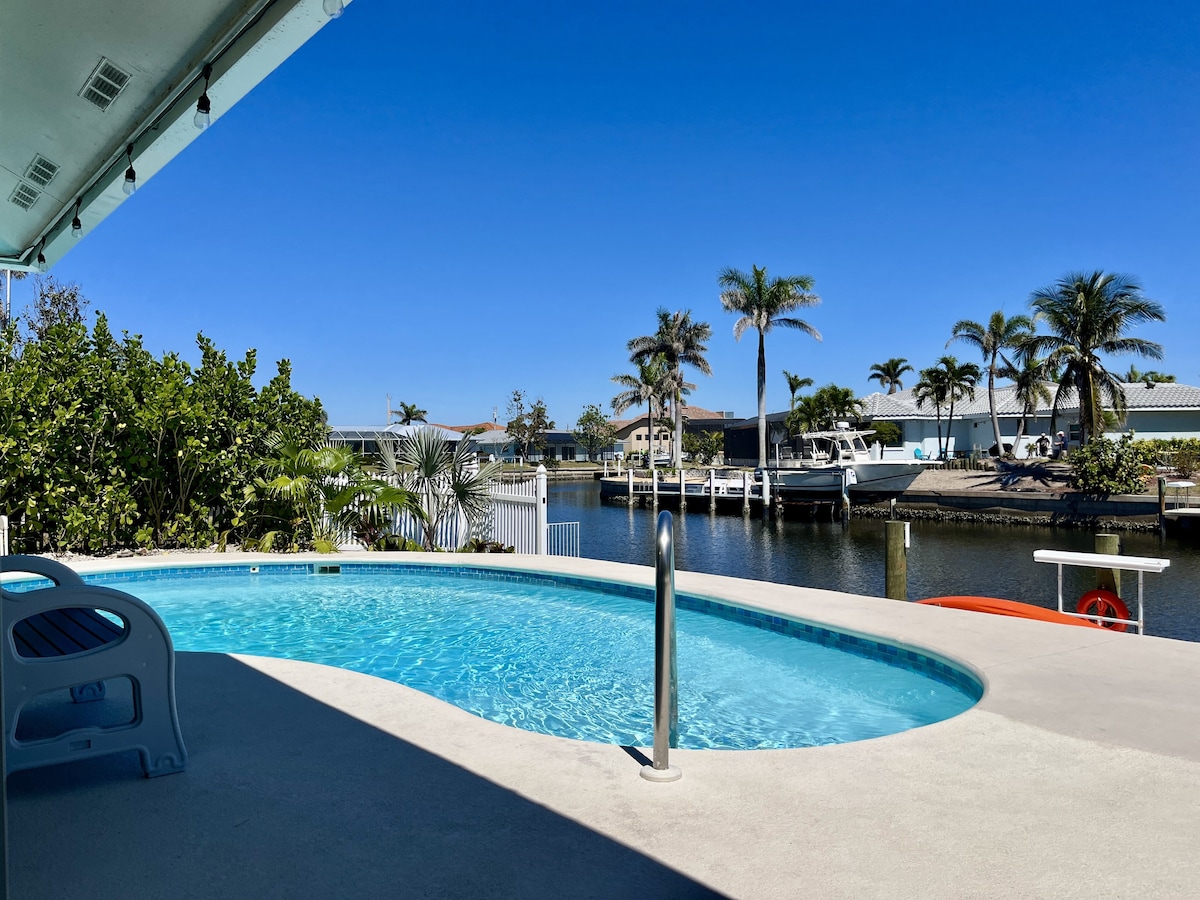 Waterfront canal home with dock and sail boat assess. No hurricane damage!! to Relax in a stylish, fully provisioned getaway. Bring the whole family. Boat to the Gulf of Mexico. Minutes to Charlotte Harbor, Fishermans Village, shopping, & live entertainment. Out back is a deep water sailboat canal, 80' dock, private screened in pool with toys and towels. Tommy Bahama beach chairs, umbrella & cooler for beach use Books, board games, corn hole. High speed wifi.