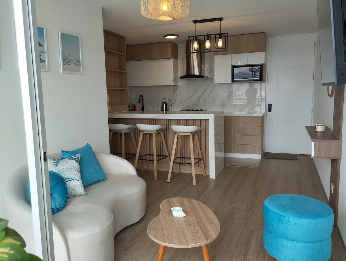 Disfruta frente al mar en este acogedor departamento totalmente equipado para dos personas, ubicado en un moderno y elegante condominio con una cochera. Disfruta de acceso directo a la playa y de un Club House de primer nivel, que incluye dos piscinas, un bar, jacuzzi, sauna, zona de masajes, gimnasio bien equipado, y área de juegos. Un entorno perfecto para relajarte, compartir y vivir una experiencia única, en una ubicación privilegiada con excelente vista y acceso al mar.