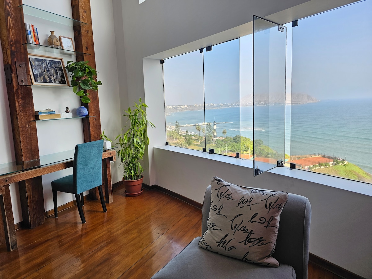 Entire loft for two guests in Barranco, located in a historic heritage house, fully renovated on Malecón Castilla, with stunning views over Lima Bay. Set in the heart of the historic district, just steps from the Bridge of Sighs, surrounded by cafés, art, restaurants, and nightlife, with direct access to the sea. Only a short walk from the Pedro de Osma Museum and the MATE – Mario Testino Museum.