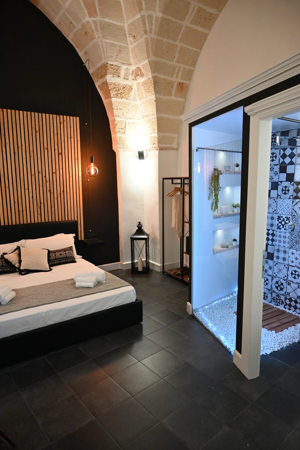 Nel cuore della Lecce barocca vicino alla Chiesa di Santa Croce, un alloggio rifinito con doppio accesso, camera da letto in soppalco, bagno, SPA privata ed un terrazzo (comune) con minipiscina, solarium e splendida vista sulla città. In the heart of the baroque Lecce near the church of Santa Croce a refined accommodation with double entrance, bedroom on mezzanine, bathroom, private SPA and a terrace (in common with other guests) with mini pool, solarium and a wonderful view of the city.