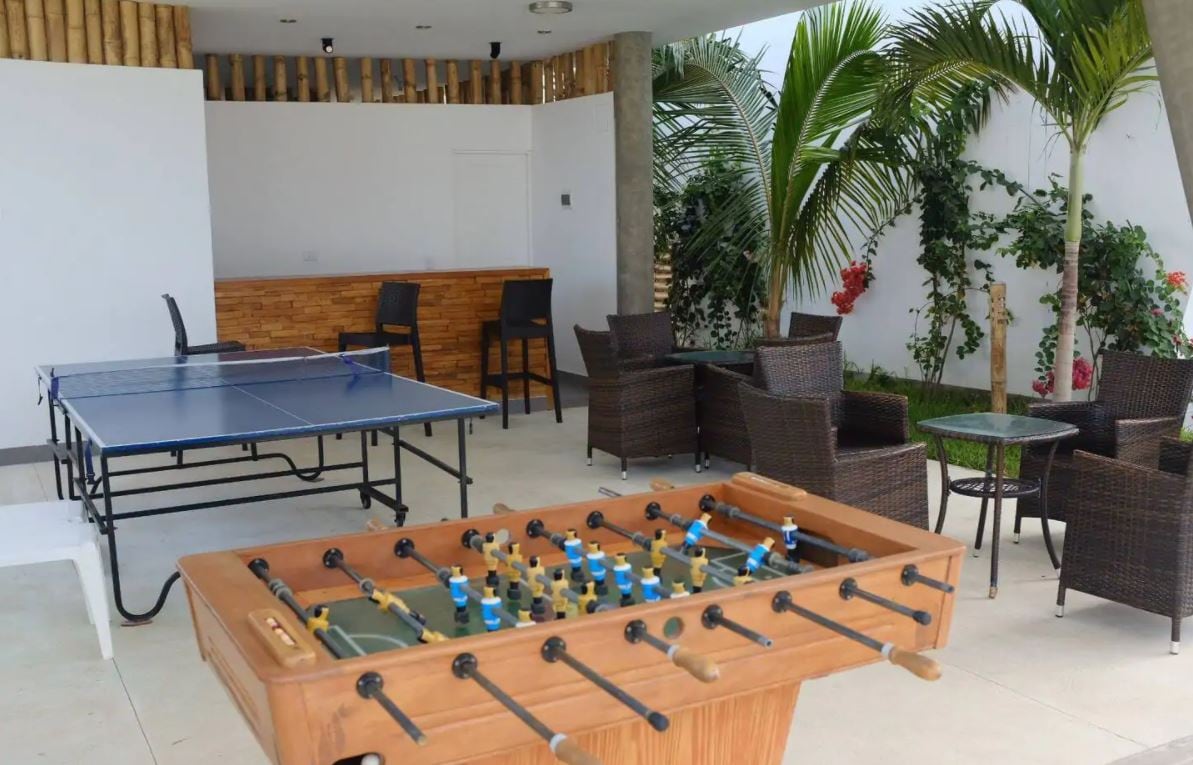 Lindo departamento, súper equipado y amoblado en primer piso. Cuenta con una amplia terraza con parrilla, sala, comedor, bar y cocina, con 2 cómodas habitaciones con cama queen y camarotes para un total de 9 personas. Aire acondicionado, WIFI, Direct TV. Ubicado en el condominio de playa Las Palmeras de Bocapan -Zorritos Tumbes frente al mar, con piscina, club house con juegos, kayaks, zona de fogata, playa con mar tibio y sin piedras a pocos metros y sol todo el año. ¡Te esperamos!