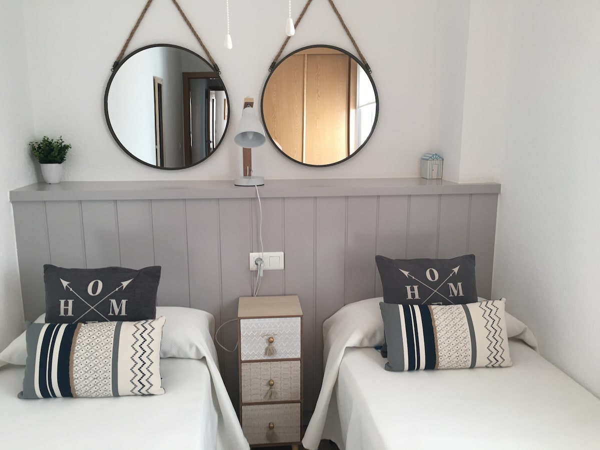 EL apartamento es amplio 90 M y GARAJE DE 23 METROS con puerta independiente . AIRE ACONDICIONADO EN TODOS LAS HABITACIONES . BAÑERA GRANDE .Balcón con sillas y mesa es un 2° muy equipado para estar como en casa , Sabanas y toallas de baño y de mano , radiadores Calor . menaje playa 4 sillas playa, sombrilla Grande, nevera . Equipado para niños bajo petición Trona, parque cuna con colchón , vigilancia de sonido , platos , cubiertos, ETC .El barrio tranquilo, con zonas verdes.