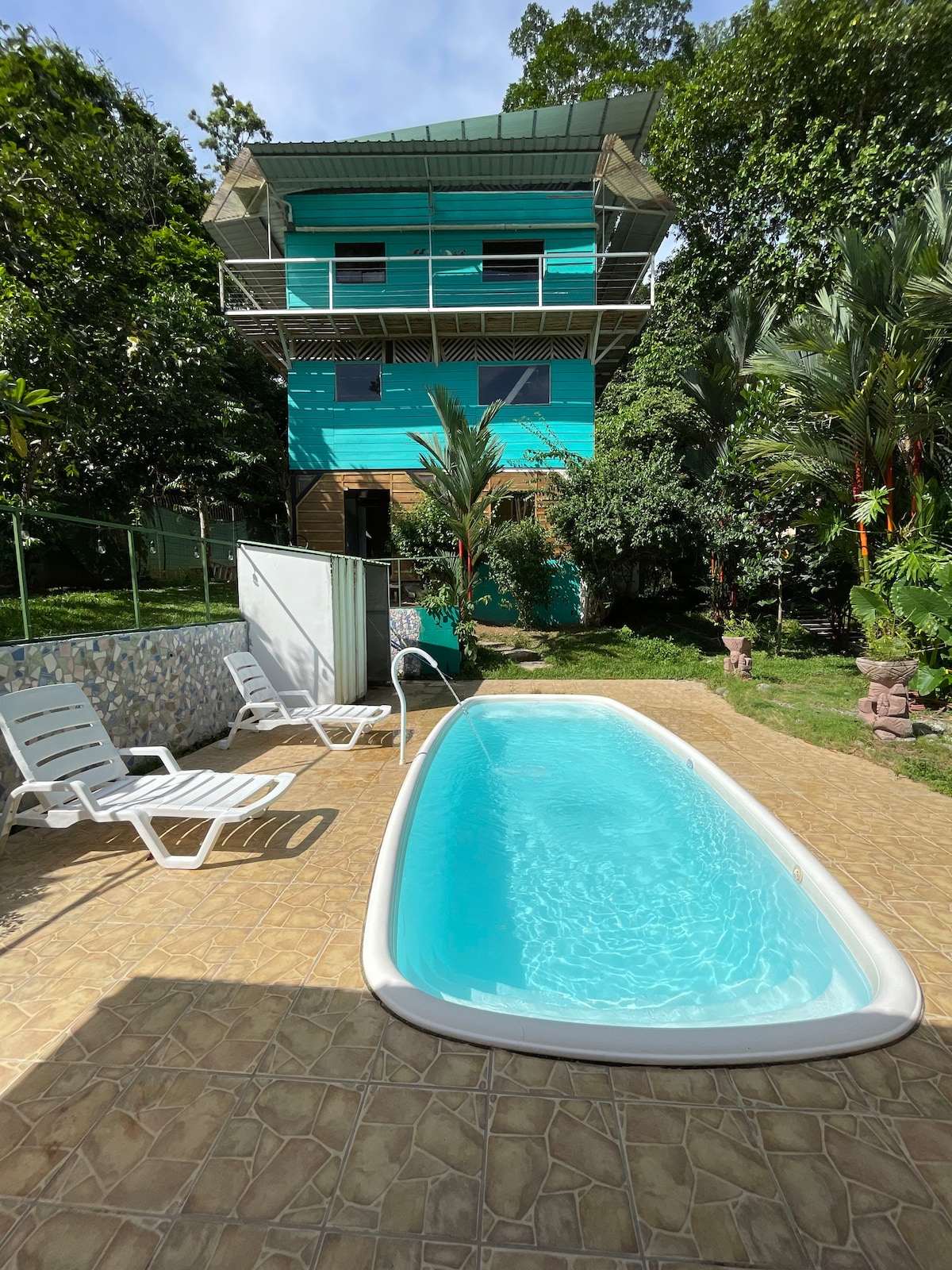 Beautiful beachfront house for up to ten people. Located just 30 m. from a white sandy beach and surrounded by lush nature. Private swimming pool. Coral reefs. Puerto Viejo town, with all its amenities and nightlife, is only a few kilometers away (about 7 minutes by car). A small grocery store and restaurants within walking distance. The garden is full of tropical flora and fauna , monkeys, toucans, and more are seen. The sea is usually calm, clear, and very safe for swimming and snorkeling.