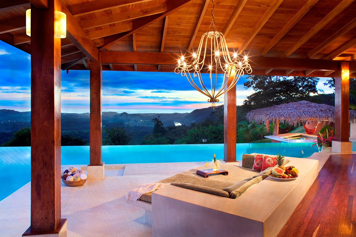 Tucked away in the lush jungle of the Black Stallion Eco Park, this luxurious, natural villa enjoys stunning sunsets and soaring views of the Costa Rican countryside. Wake up each day to the sounds of chirping birds. Step outside to explore the property and spot wildlife and tropical greenery. After, slide into the pool’s sunken loungers and enjoy the sun. Later, head to Tamarindo for dinner. Copyright © Luxury Retreats. All rights reserved.