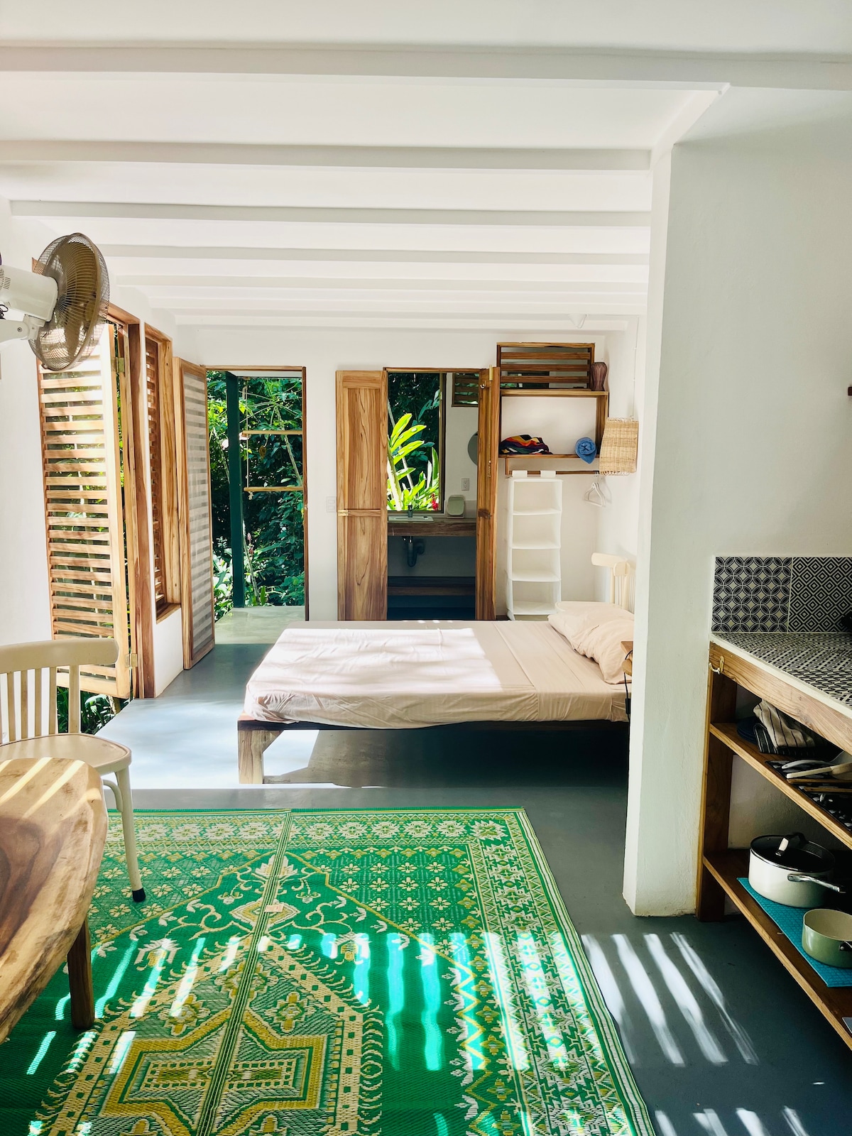 New studio equipped with a kitchen,A/C, on the terrace,on a property ideally located in the heart of nature by the river, 800 m from the beautiful beach of Coclès, 2 km from the center of Puerto Viejo and 6 km from the very famous Punta Uva beach.GOOD WIFI (Starlink).Possibility to observe animals (toucans,monkeys, sloths and many others). Many visits nearby such as the Cahuita national park,the Jaguar rescue center,the Manzanillo park or the Ara project. Restaurant and supermarket at 800m