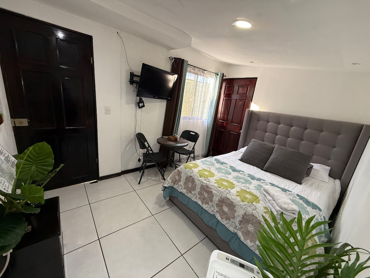 Apartamento ubicado en Urbanización la Favorita. Es muy céntrico y goza de parques, restaurantes, clínicas, hospitales México/Cima, supermercados, embajadas y aeropuertos cerca. Muy cerca de la Embajada de USA y consulado Canadá. El dormitorio está equipado con un área adicional para esparcimiento o trabajo. Seguridad 24/7. Baño con agua caliente. Barrio tranquilo. Refrigeradora, microondas, coffee maker, sartén eléctrico, hornilla de un disco,olla arrocera y calentador de agua. Excelente WIFI
