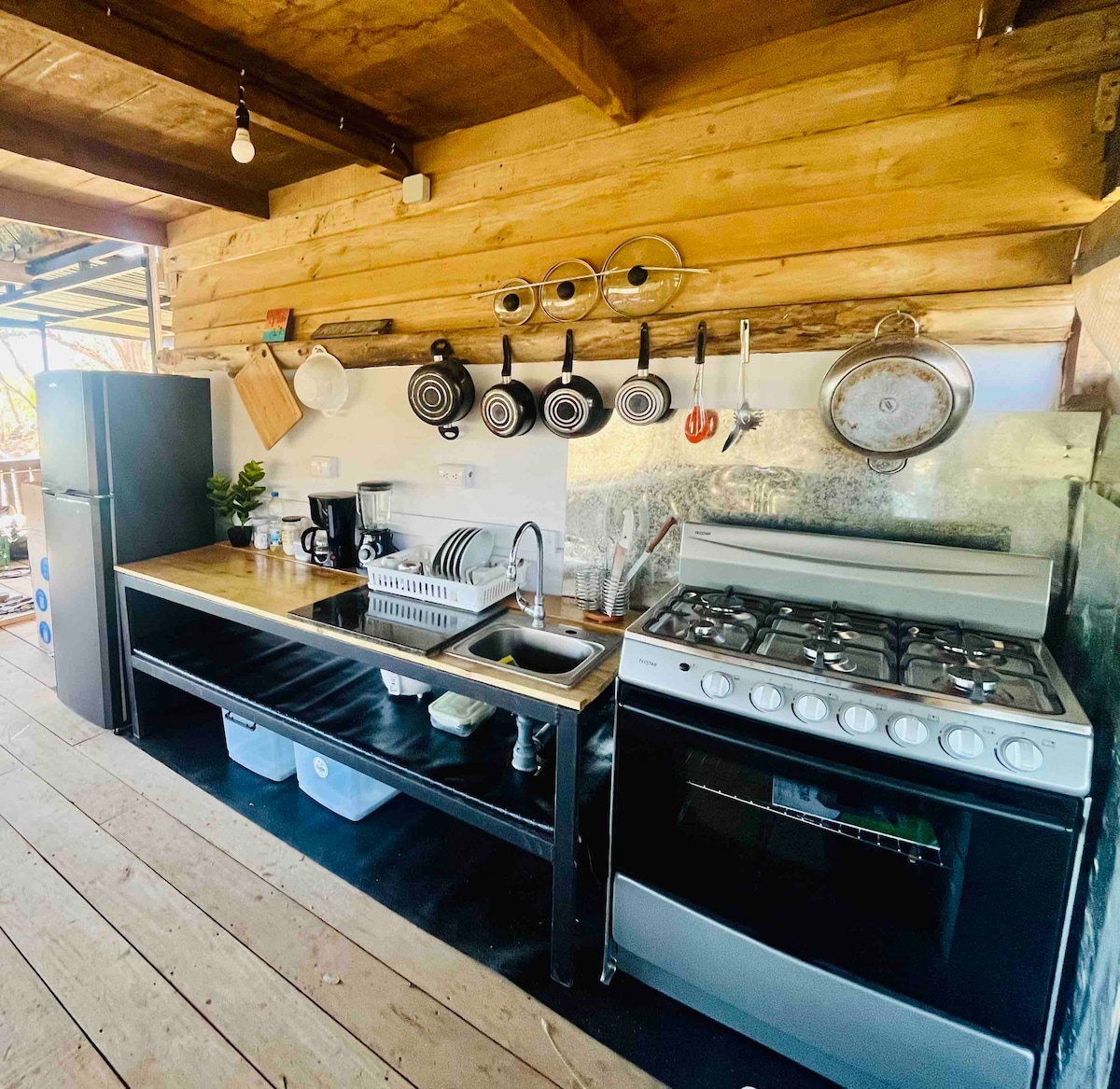 Be part of the nature and explore an amazing experience in the jungle at few minutes from the beach. The main area is a tipycal old rancho where u can find the open kitchen and living surrounded by the nature. Just take a sit, relax and enjoy the sounds and the wildlife from your patio. The area is plenty of birds like colibrî, hawks, osprey also fox, deer and coyotes at night. Separate from the main area there’s the bedroom which is a modern concept made with iron and glass.