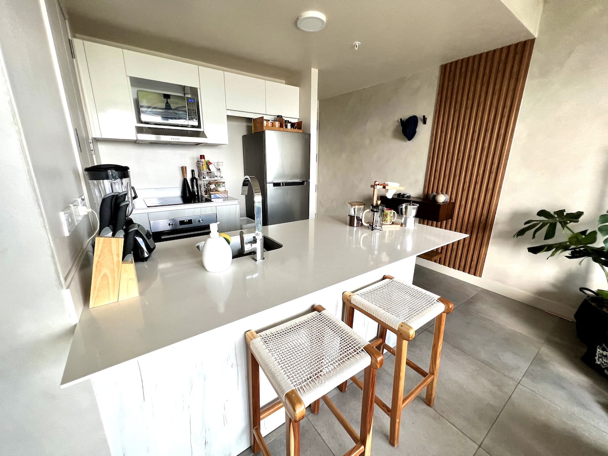 Relax into a unique Japandi-style experience in a new, luxurious tower. The stylish decor, full kitchen, and a dedicated desk with high-speed internet provide a perfect blend of comfort and productivity for any traveler. Enjoy stunning sunrises, sunsets, and night views from your own private space, adding a touch of luxury and relaxation to your stay. Enjoy a pool, rooftop lounges, a cinema, a gym, co-working spaces, and an on-site food court, offering a complete vacation experience.