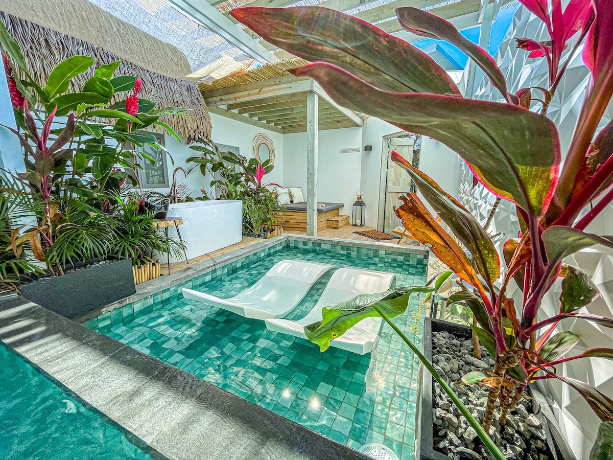 丛林私人泳池套房,室外浴缸,距离海滩4分钟