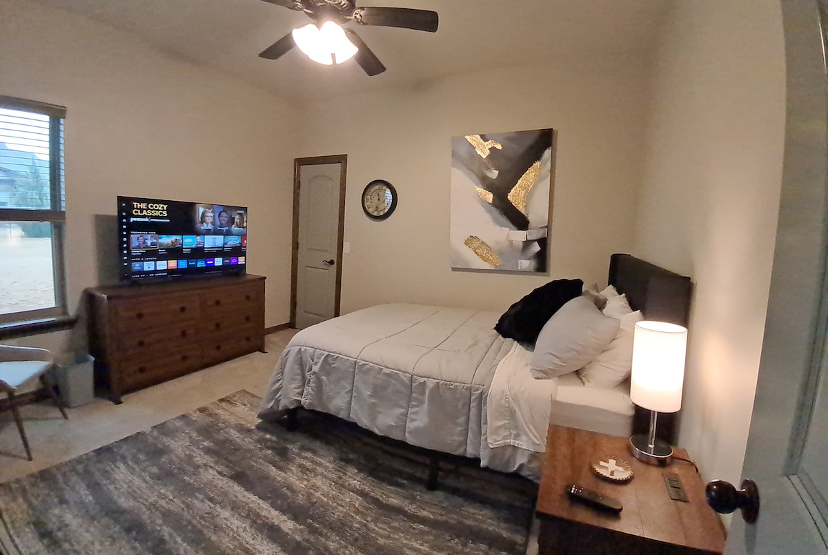 Experience small-town charm in our cozy 2 bedroom, 1 bath house in Wanette, Ok. Unwind in two bedrooms featuring comfortable queen-size beds, each equipped with a TV for your entertainment. Enjoy the warmth of electric fireplaces in both the master bedroom and living room. Our fully furnished kitchen awaits your culinary adventures. Relax in the large backyard, perfect for gatherings or stargazing. Immerse yourself in the welcoming atmosphere of Wanette, making your stay a delightful retreat.