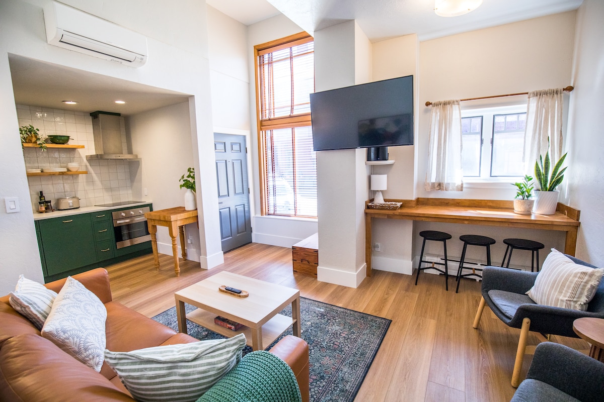 Enjoy the central location of the historic Jarvis Suites. This one-bedroom condo has a well-stocked kitchen, pull out couch and large upstairs bedroom with queen size bed and a desk for the essential workspace. This cozy condo is close to everything, you can walk to restaurants, bars, shopping, grocery/liquor stores and Walgreens. You are also just blocks from the river trail and hiking/biking trails. Park your car in the free assigned spot and leave it there for the rest of your trip.
