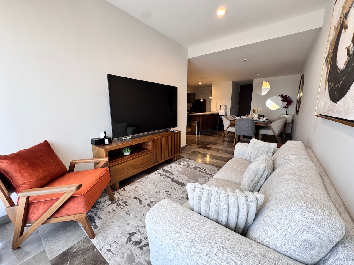 Hermoso departamento a 5 minutos del centro de la ciudad, cuenta con dos amplías recámaras con camas matrimoniales y dos sofás cama bastante cómodos ubicados en la sala. La cocina está completamente equipada y podrás ver la tv desde la sala o el comedor. Cuenta con espacio de estacionamiento de un auto. Para accesar al departamento hay que subir un piso de escaleras. Se puede subir a la terraza.