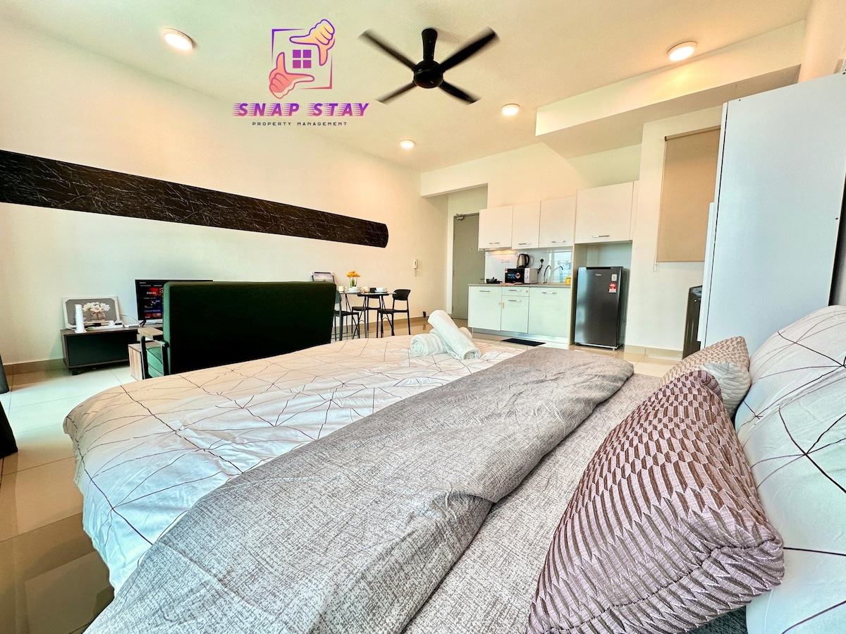 Explore our cozy studio, which can accommodate 2 to 3 people with a queen bed and a sofa bed. Only a 15-minute drive from KLIA T1/T2, the place is surrounded by many restaurants, fast food branches, groceries, and laundry shops, all within walking distance. Savor all the amenities, including the kids’ playground, BBQ area, gym, and swimming pool, with 24/7 security. * Unavailable drop your luggage before check in hours.Due to building designed, need to walk 10 steps staircase to get elevator.