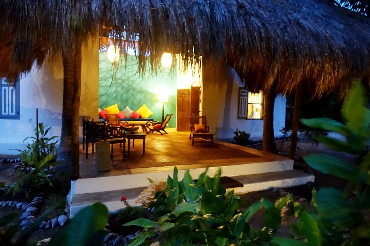 Escape to our unique Bottle House, surrounded by lush coconut plantations. Wake up to peacocks and cuckoos in the garden, walk just 250m to a deserted beach, and watch breathtaking sunsets from the sand dune. Enjoy home-cooked meals, dolphin & whale watching, and diving. The house features a cozy 4-bed bedroom, a spacious terrace with a fruit garden view, a romantic roofless bathroom, and a kitchen. Mosquito nets included. Baby pool available. Free drinking water. No neighbors!