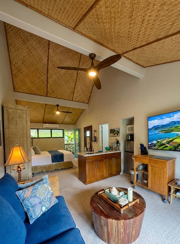 This beautiful remodeled studio is located on Kaua'i's lush and romantic North Shore. Furnished with A/C, VITAMIX Blender, Heavenly king size bed, kitchenette, hot plate, 2 flat screen tvs, and reliable wifi. Be ready to enjoy the breathtaking views and world class hiking, snorkeling, and beaches from this ideal North shore location. A quick walk to Hideaways Beach and Queen’s Bath and short drive to Hanalei. It’s more than just a vacation home, it's paradise!