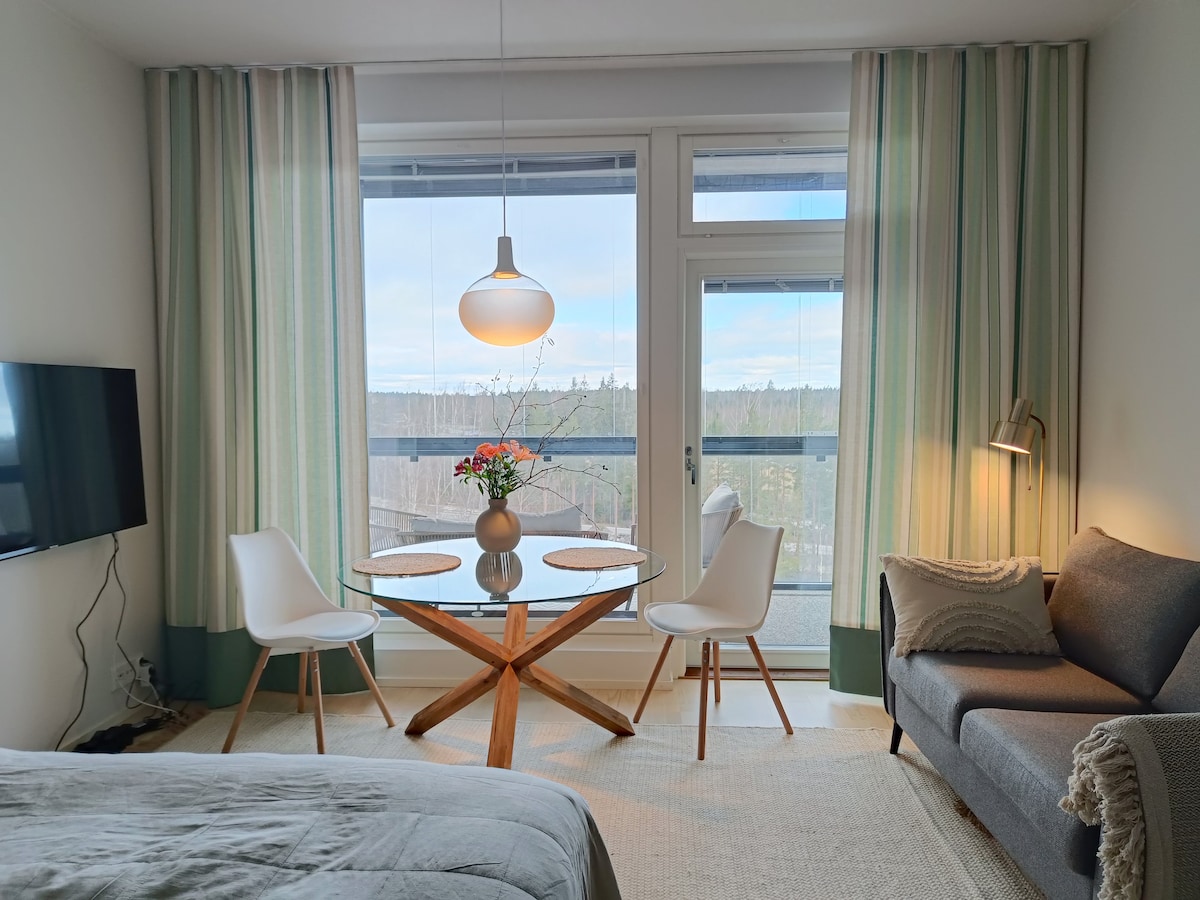 Take it easy at this unique getaway and enjoy your stay in this fairly new 34 m2 condo & studio (+13 m2 balcony). Calm neighborhood with excellent transportation connections makes accommodation comfortable and makes you feel like home. The bus stops are located right near near the apartment and the metro station is only a 5-minute walk away (450 meters from the apartment) which takes you to the city center within 12 minutes.