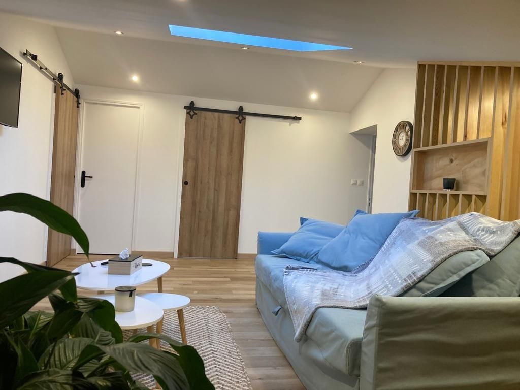 Nid douillet privé en entresol dans ancien hôtel rénové au cœur du village en desertification de Rochefort Montagne idéal pour randonnée, ski, et découverte de l'auvergne, du Sancy et de la chaine des puys. Baignoire à remous, climatisation, lit Emperor (2x2m), Matelas EMMA sur lattes, cuisine toute équipée avec lave vaisselle, four, four micro ondes, batterie d'ustensiles, fondue, crêpe, raclette, feux gaz et plaques induction, réfrigérateur SMEG, lave linge, sèche linge, TV LG