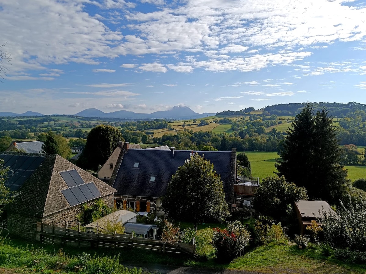 Dans un gite ( prix réduit sur une réservation à la semaine) créé dans une grange en pisé de 1850, sur 120m2 une grande pièces à vivre et à l’étage 2 grandes chambres s’ouvrant sur une terrasse de 40m2 avec vue sur le grün du Chignore, table et BBQ dans le jardin. En hiver venez vous réchauffer au bord de l'insert en rentrant de balade et en mangeant une raclette ou des crêpes. Randonnée à gogo dans le parc du Livradois Forez, lac et rivière. On aime le renouveau Val et Titi Dogfriendly