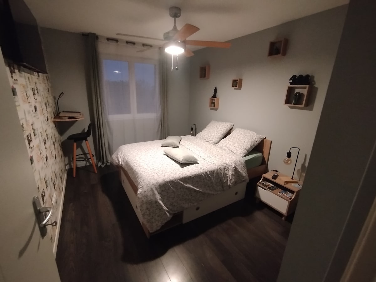 Logement indépendant à Aubière. Literie 160x200, douche et WC séparé. TV via chromecast (Molotov, Prime, Netflix). micro-onde, petit frigo, cafetière, bouilloire, assiettes et couverts. Sont inclus: -les petits déjeuners (café, thé, lait, Nesquik, jus de fruits, madeleine, céréales, miel, confiture, Nutella...), -les draps (lit fait à l'arrivée), -les serviettes, gel douche et shampoing. Petit espace extérieur devant le logement. Entrée indépendante, arrivée autonome (boîte à clé).