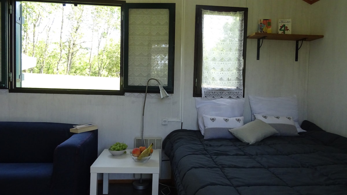 La cabane des roches classée 2 étoiles est ravie de vous accueillir lors d'un séjour de déconnexion. En effet, venez vous réfugier dans ce petit cocon douillet au cœur de la nature. Pour vous accueillir, un grand lit de 160*200 et si vous êtes assez curieux et assez agile pour vous cacher dans la mezzanine , 2 lits de 90*200 vous attendent. Nous avons mis tout notre cœur dans la fabrication de cette cabane pour que chaque personne se sente bien et apprécie au mieux son séjour.