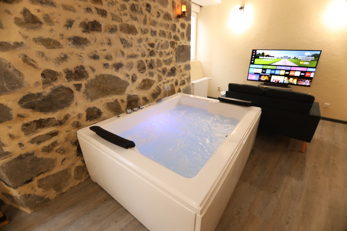 Nid douillet privé en entresol dans ancien hôtel rénové au cœur du village en desertification de Rochefort Montagne idéal pour randonnée, ski, et découverte de l'auvergne, du Sancy et de la chaine des puys. Baignoire à remous, climatisation, lit Emperor (2x2m), Matelas EMMA sur lattes, cuisine toute équipée avec lave vaisselle, four, four micro ondes, batterie d'ustensiles, fondue, crêpe, raclette, feux gaz et plaques induction, réfrigérateur SMEG, lave linge, sèche linge, TV LG