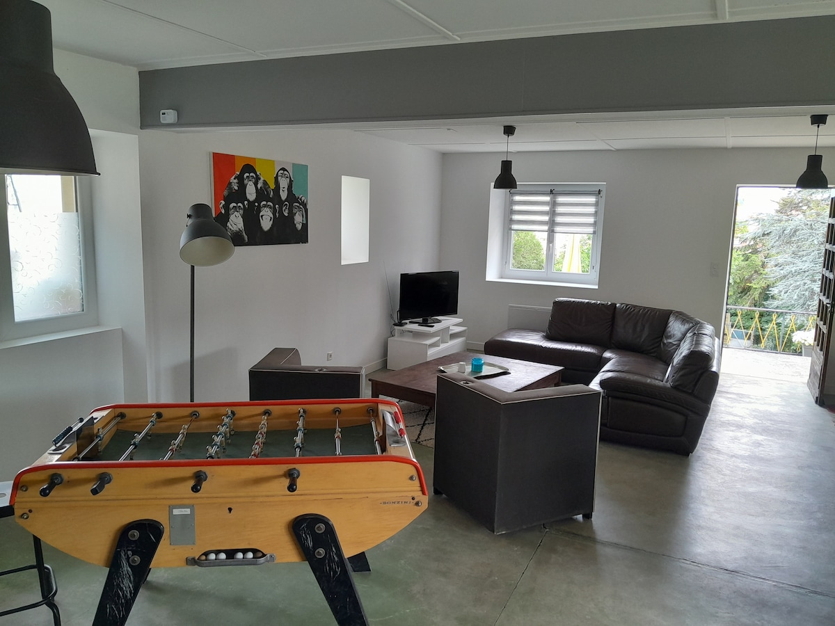 Séjournez dans notre Loft ! Beau gîte refait à neuf situé à 8 minutes à pieds du centre ville. Cuisine équipée ouverte sur la pièce de vie de 60m² avec poêle à granules, 2 chambres (1 avec lit 160x200 et 1 autre avec 1 lit 160x200 + 1 lit 140x200, toute la literie est neuve), salle de bain avec douche, terrasse aménagée de 30 m² donnant sur le jardin. A votre disposition également le jardin, barbecue, terrain de pétanque, table de ping-pong . stationnement gratuit devant le Loft