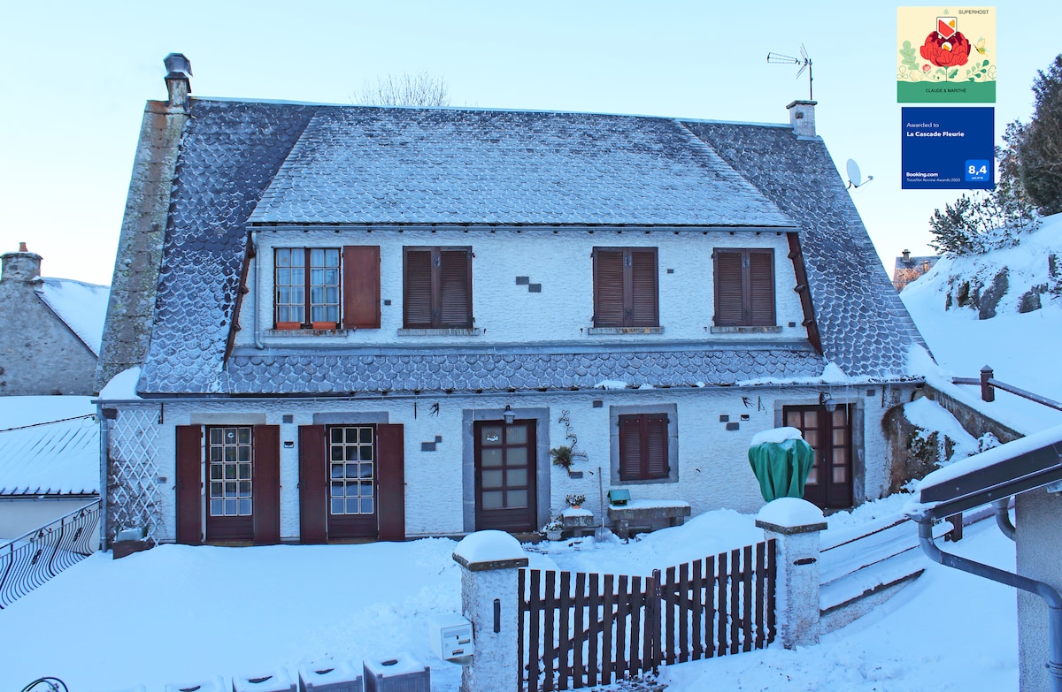 Appartement au rez-de-chaussée de la maison des propriétaires, entrée indépendante, situé à trois kilomètres du village, vue dégagée sur les sommets du Cantal, situation très calme. La cuisine est équipée (frigo, plaques induction, machine à café, lave vaisselle, four et four micro-onde). La piscine est à votre disposition aux beaux jours (la piscine n'est pas chauffée). Les animaux sont acceptés mais le terrain n'est pas clôturé et je mets à disposition un plaid pour le canapé si nécessaire.