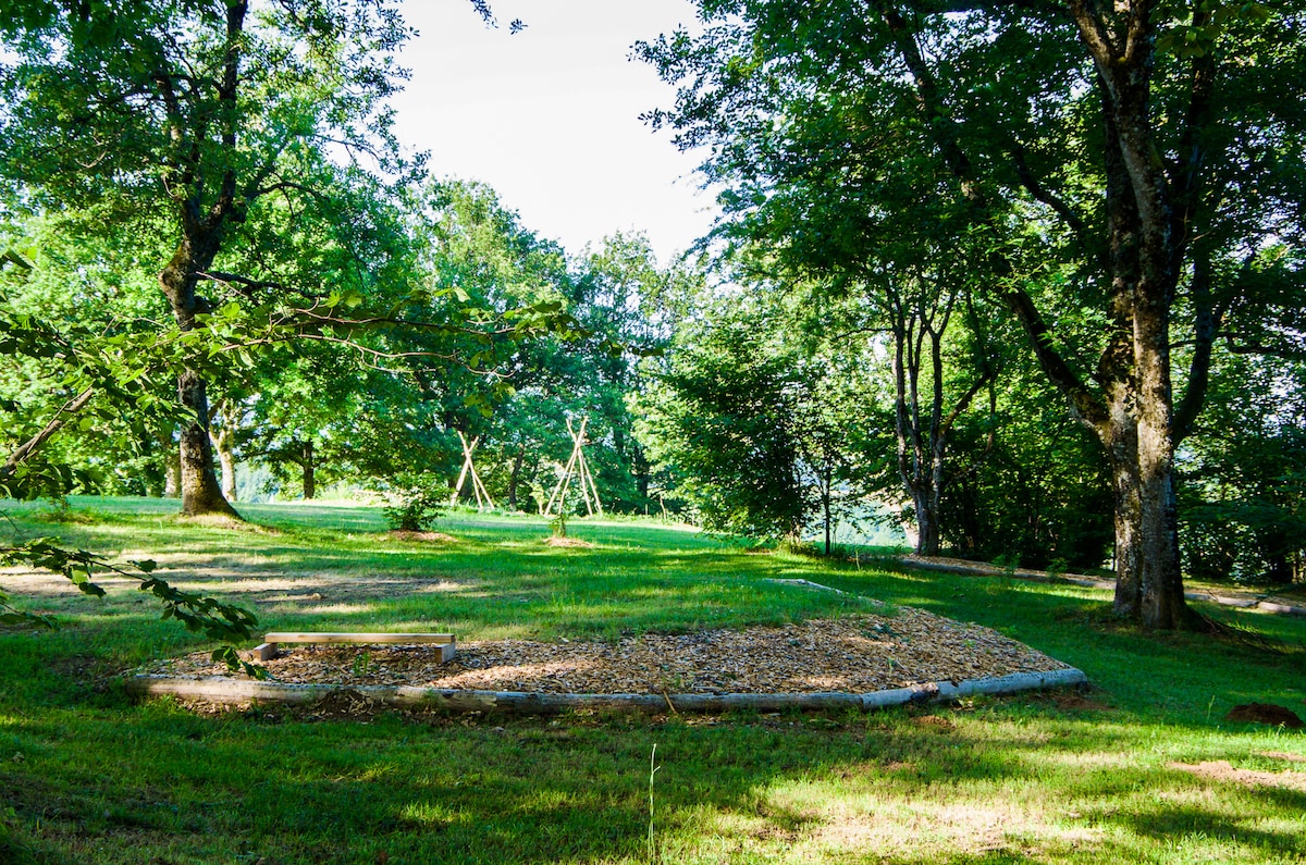 Dans un cadre idyllique de moyenne montagne, nous vous proposons une tente lodge située dans notre petite aire naturelle de repos de 6 emplacements. Située à 750 mètres d'altitude vous disposerez de tout le confort d'une chambre dans une tente Avec pour seul bruit, le chant des oiseaux, venez vous ressourcez et profitez de notre belle nature.