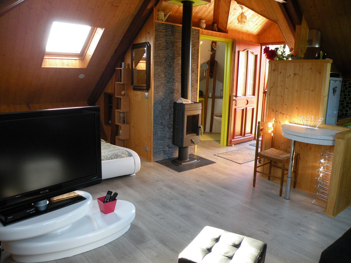 Notre maison est prévue pour une famille avec enfants, confortable pour un couple. -Nous vous proposons un studio : Table pour les repas, Mini bar, Cafetière, bouilloire. -Pas de cuisine -Internet -Toilette et douche -Lit (1600x2000) -lit (1200x1900) -Uniquement les chiens sont acceptés : Nous demandons un supplément de 15€ par séjour et par chiens ne dépassant pas 40cm au garrot, au-delà de cette taille le supplément se monte à 30€. Nous limitons à deux le nombre de ces compagnons.