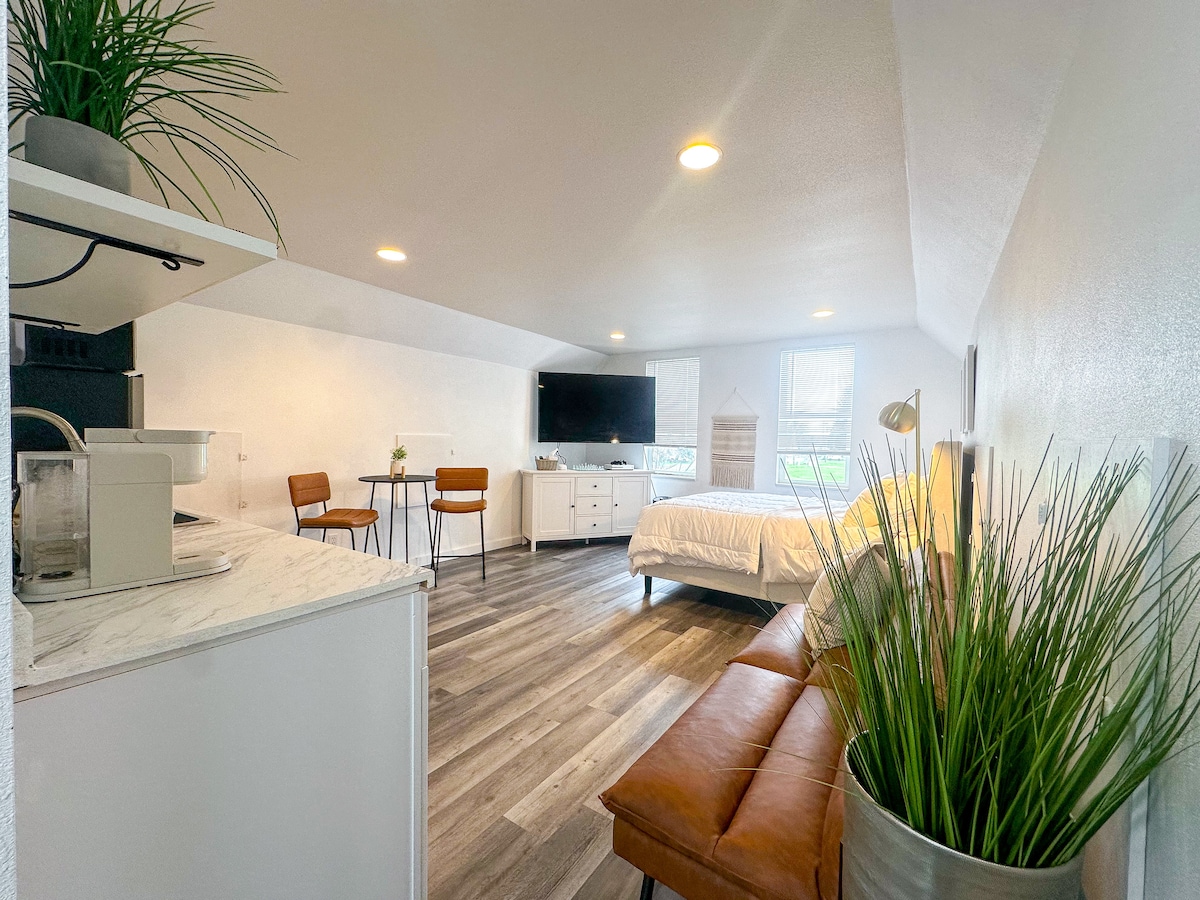 Studio is conveniently located downtown Puyallup, above garage. Air conditioned unit includes a full kitchen(stove, refrigerator, and dishwasher) with single serve coffee maker, private bathroom with slate tile flooring, and a small utility closet with a washer and dryer. 32" TV, Blue-Ray/DVD player, WiFi, and bedside table lamps with USB ports. Leather power reclining loveseat with powered head rest that also has usb ports on the side. Very close to bus route, and the Washington State Fair.